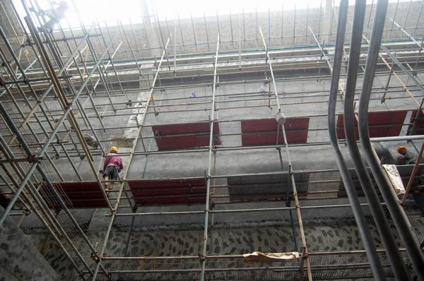 京溪污水工程系全地下施工,土建還有許多工作要同時做,拆摸、拆支撐架、拆臨時混凝土柱、砌墻、裝飾等,安裝在此交叉施工環境中進行,噪音、灰塵、潮濕、陰暗、悶熱、不通風、空間狹小。同時,交叉點多,安全要求高。只要有一個工作面,除了我們和土建,還有其他單位人員也要同時進行,消防、照明、通風、起重等,兩層地下室,每一層8-10米高,還有小型運料車輛進入。里面全是人,腳手架、孔洞,安全要求太大。而且,材料、設備搬運、吊裝困難。只有一個進出口,大的設備、材料要從吊裝口吊入,再通過自己因勢利導想的現場辦法才能運、移、吊裝到位。在里面吊車不能進,柱、梁也多,全靠人。有時一臺設備吊進去搬運安裝到位得要2天。